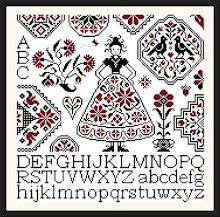 I finished her up on Easter Sunday. I had to leave off the alphabet since the piece of fabric that I used wasn't quite big enough. I've decided that she will be my first self-framing adventure.